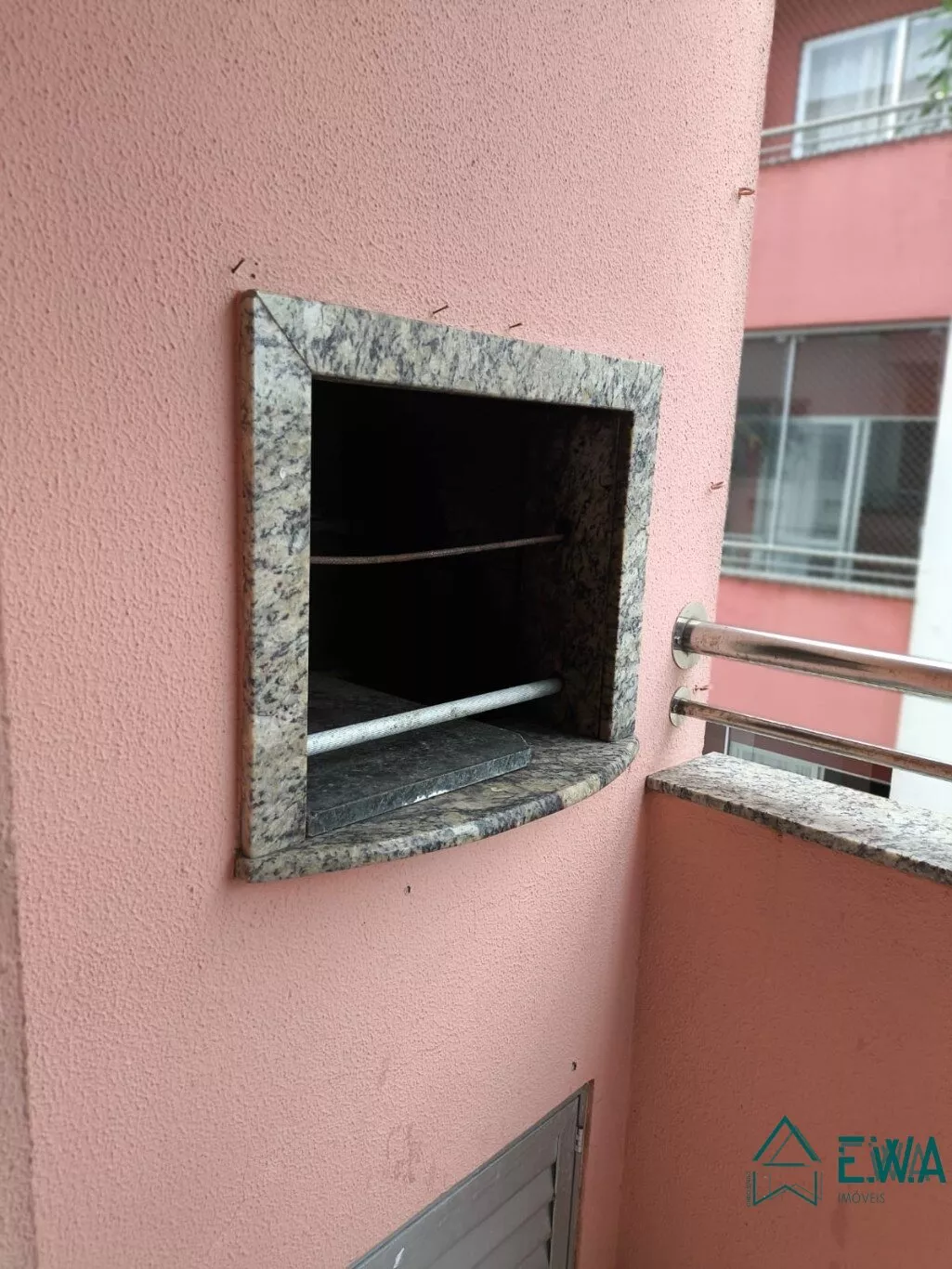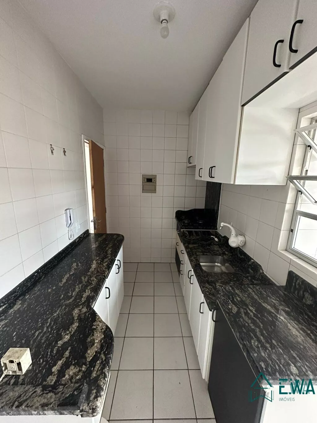 Apartamento com 3 quartos (sendo 1 com armário e cama de solteiro), sala com mesa e 4 cadeiras, sacada com churrasqueira, cozinha com armários, banheiro, área de serviço e garagem.