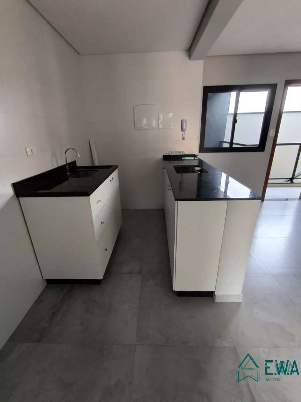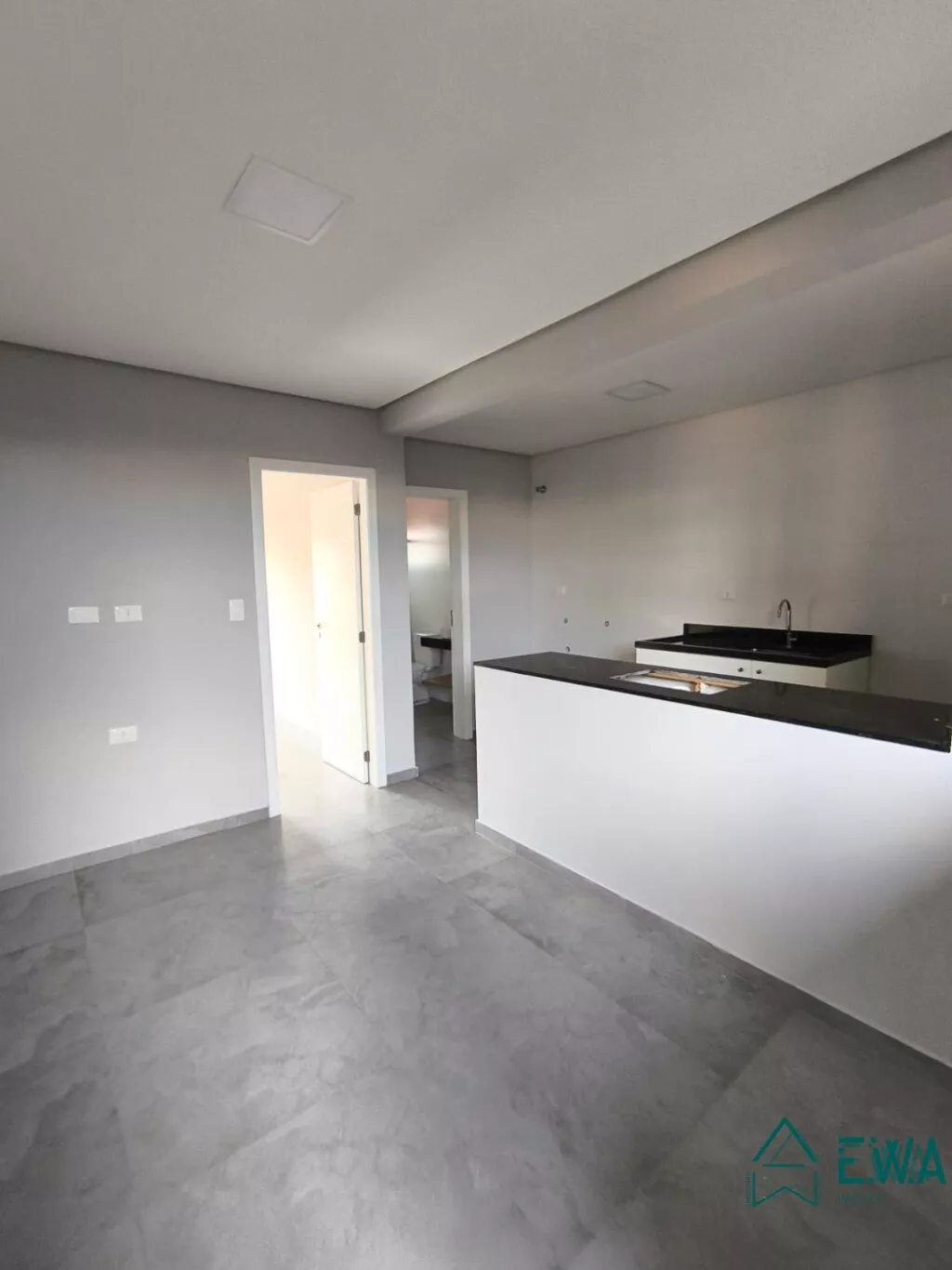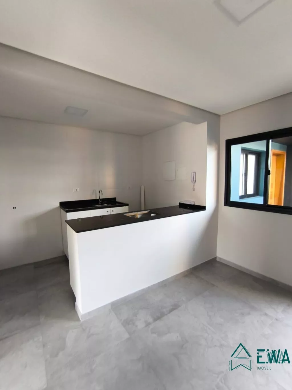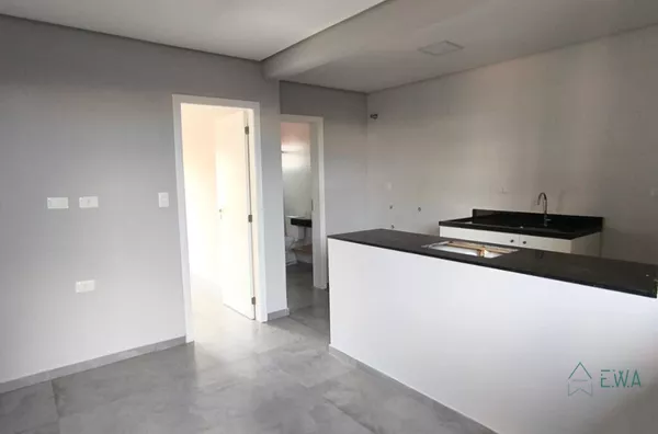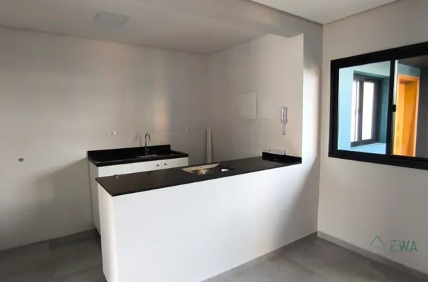 Apto com 1 quarto, sala, cozinha com armários, banheiro e sacada.