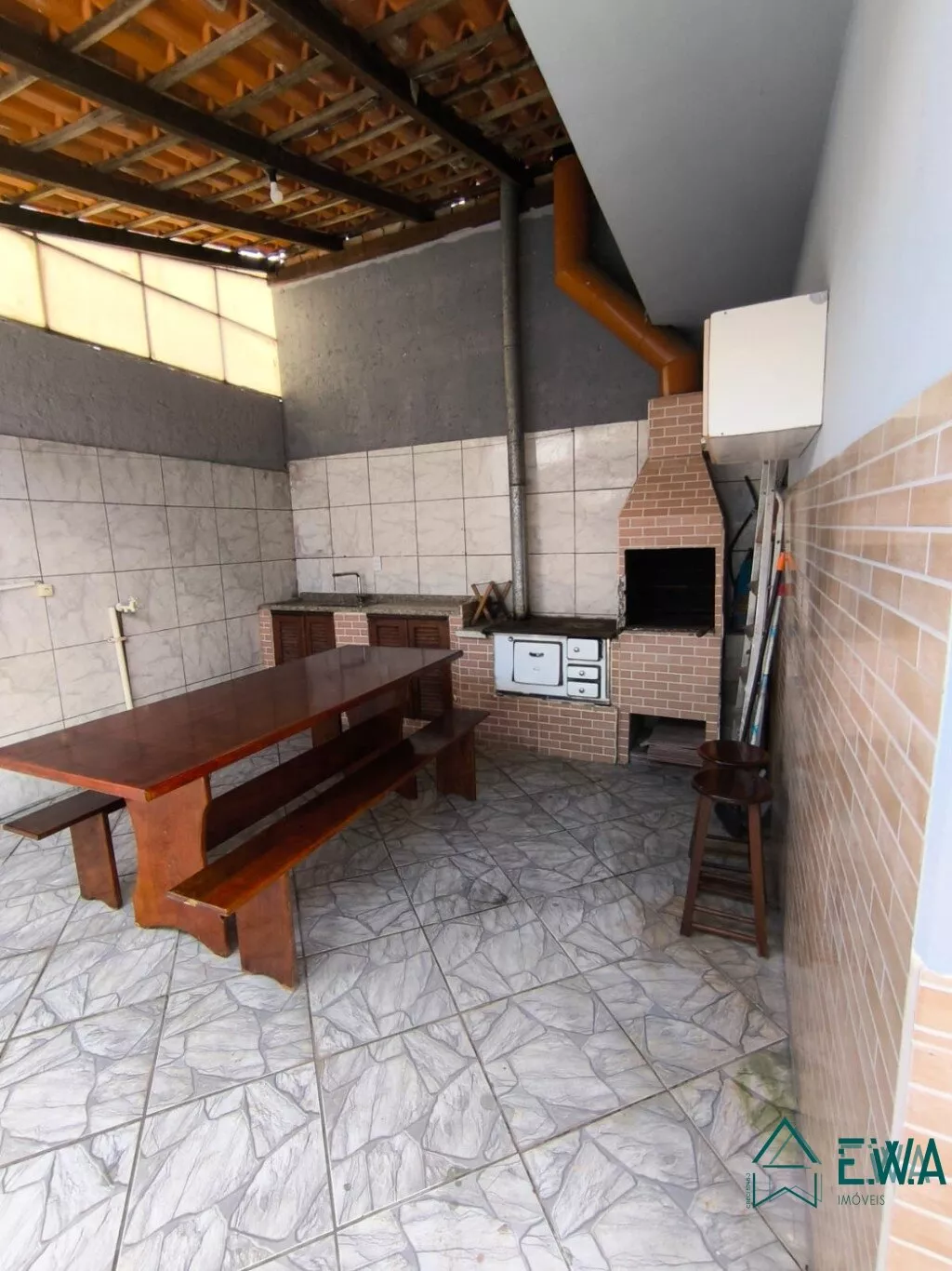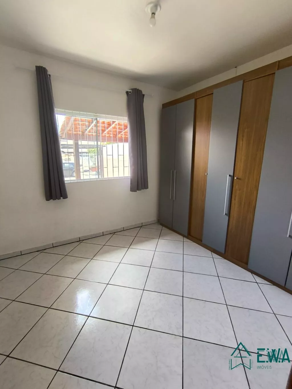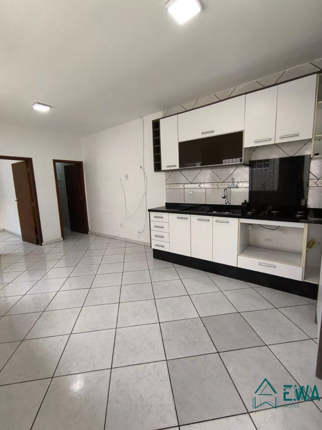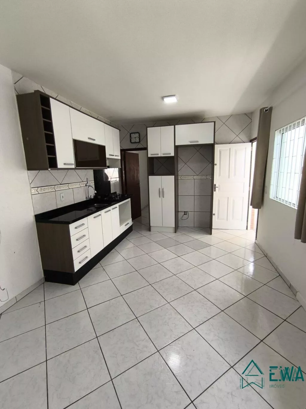 Casa com 2 quartos, sala e cozinha com armários, banheiro, área de festas, garagem, quintal.