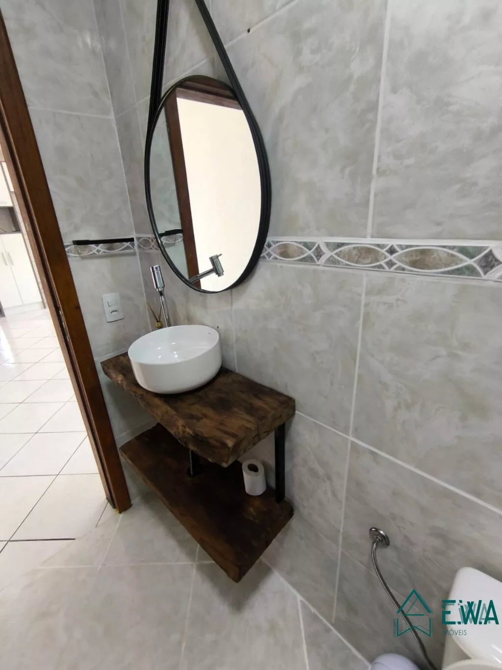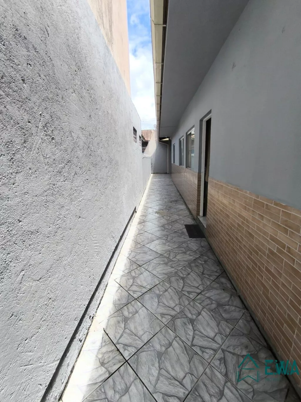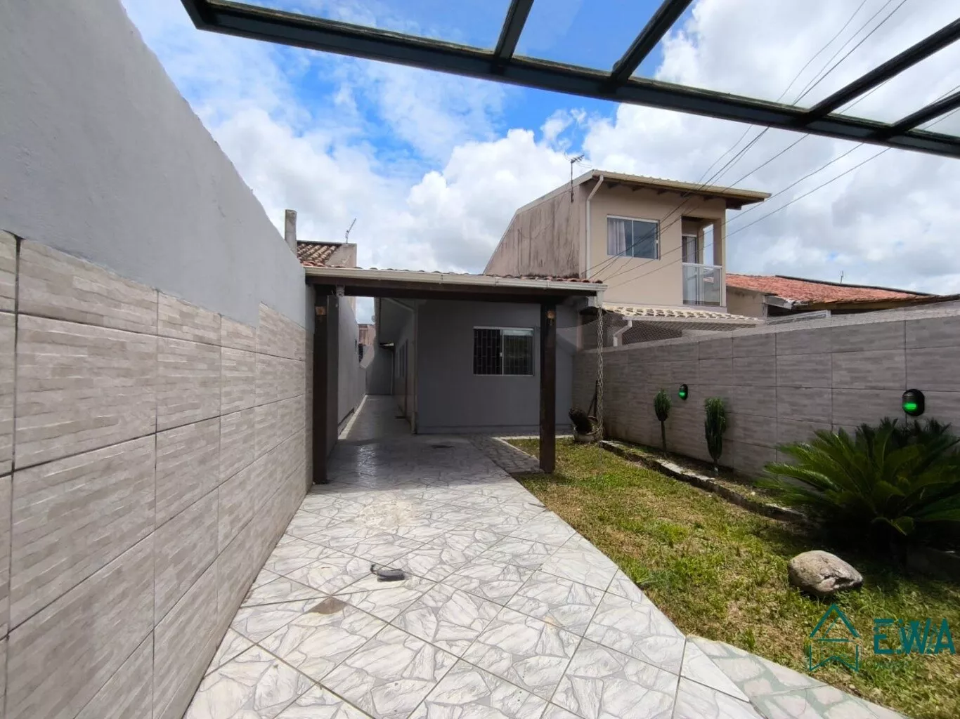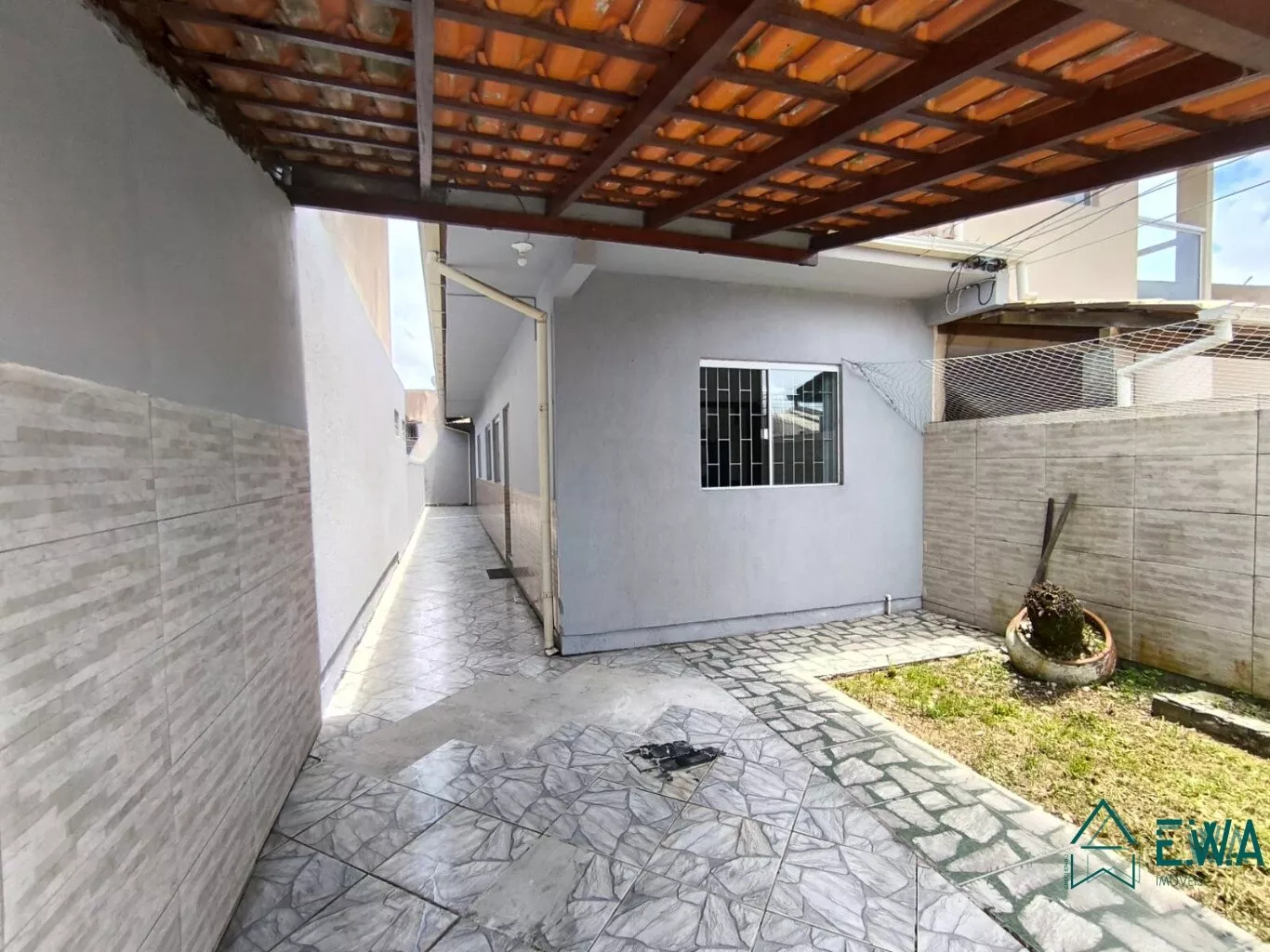 Casa com 2 quartos, sala e cozinha com armários, banheiro, área de festas, garagem, quintal.